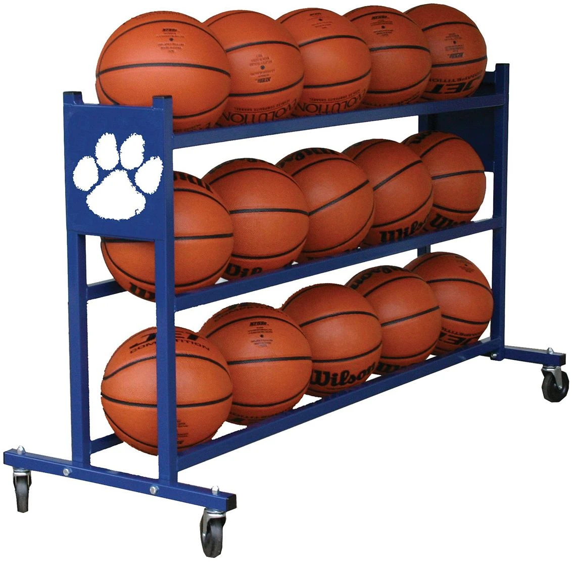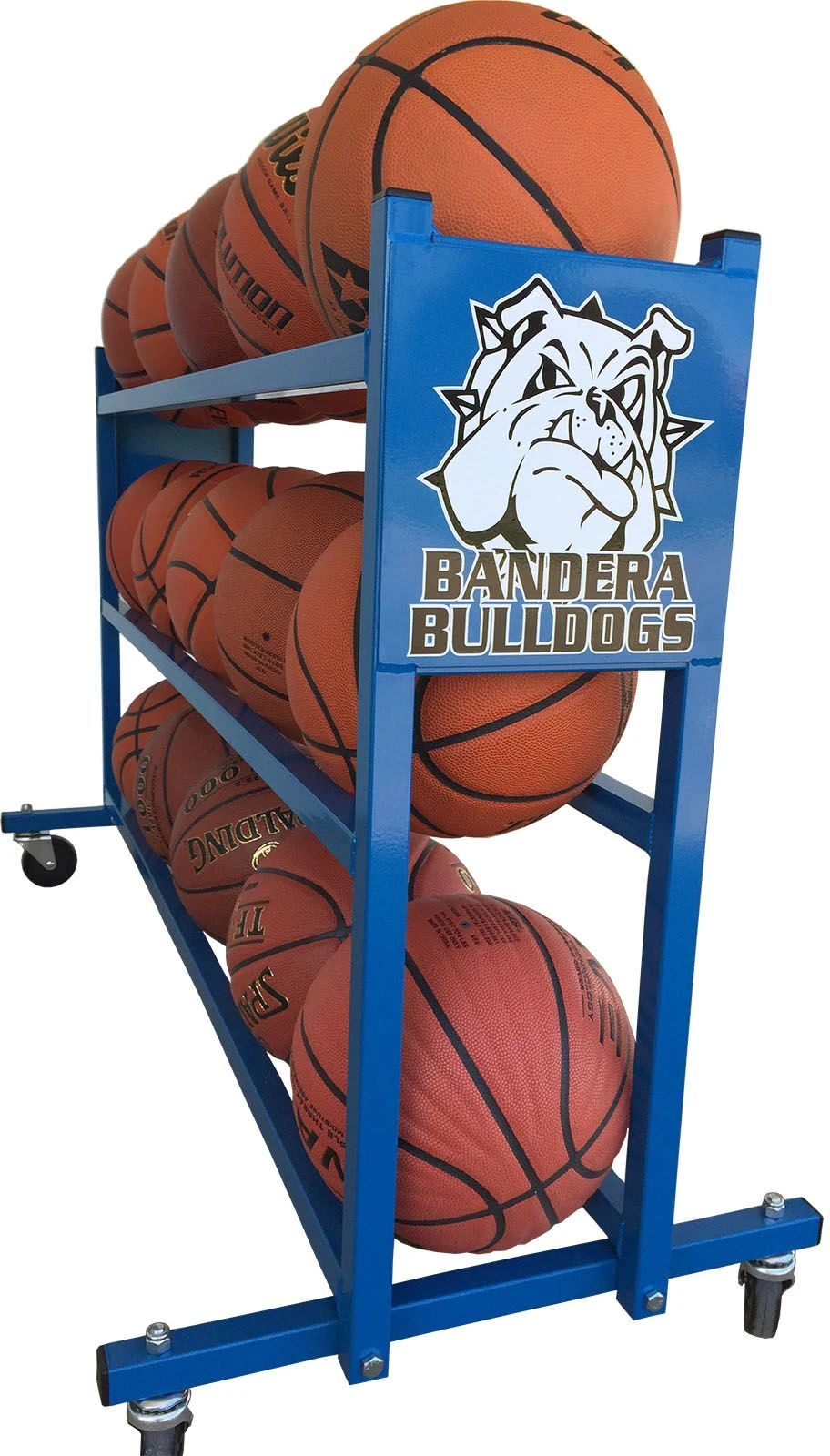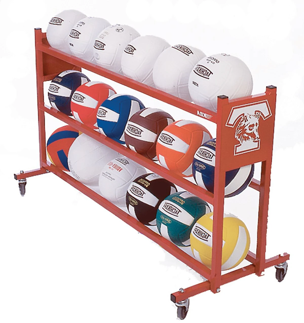 Customize a ball carrier for your team. These Ball Carriers are made of 16 gauge steel tubing. The entire body of the rack is all welded…no assembly. The wheels are heavy duty 3″ swivel casters that are non marring to your gym floor. Wheels come assembled to the axles but must be bolted to the rack with four bolts and lock nuts. This rack will not shake apart. Will last for years!!! Will hold 15 Basketballs, 18 Volleyballs or 18 Soccer Balls.