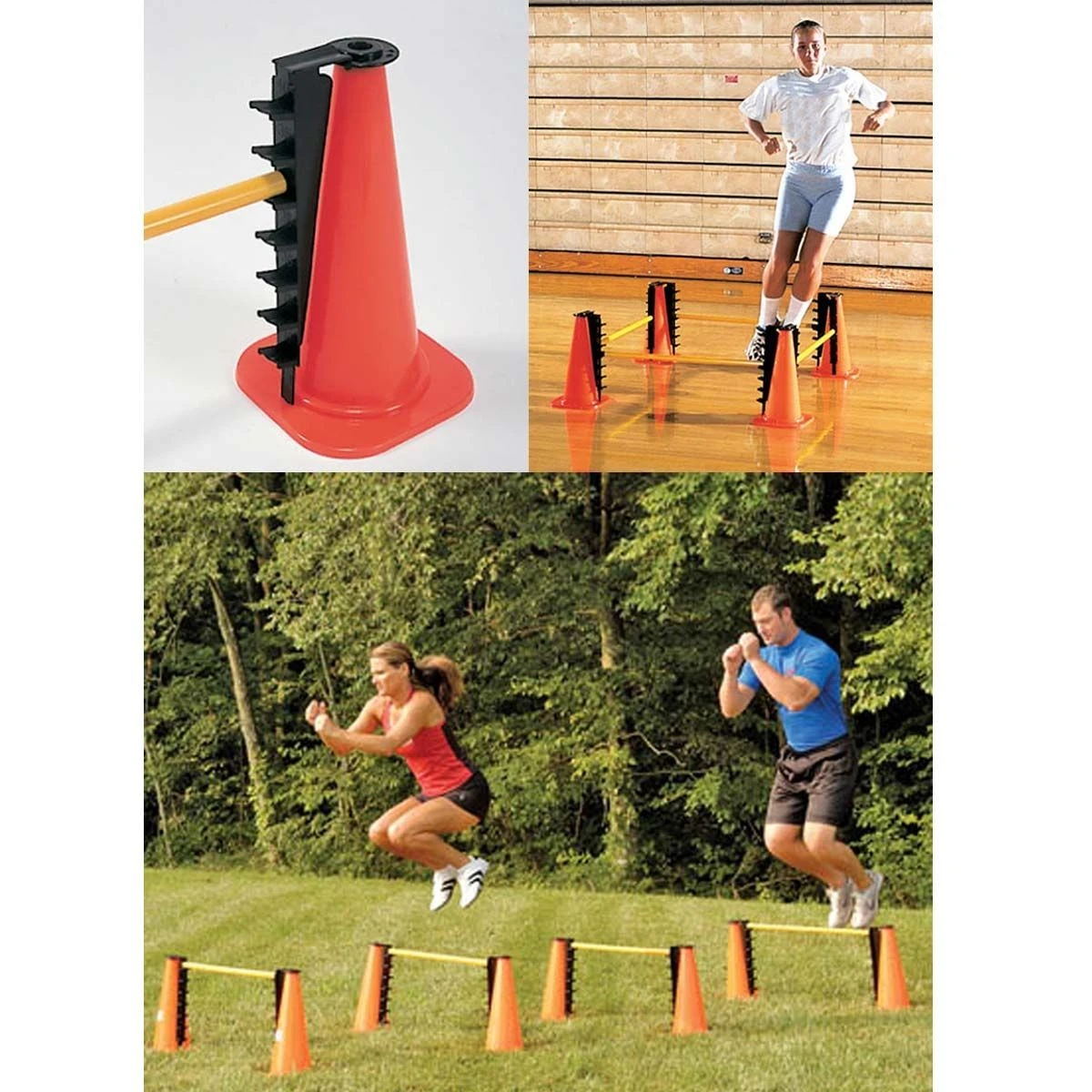 The Hurdle Cone Set is ideal for agility, speed and plyometric exercise drills. Run faster, jump farther training with this cone hurdleΒ set.Β Β Adjustable from 4” to 18”,Β the multiple set-up options let you create different patterns for developing quick foot lift and control.