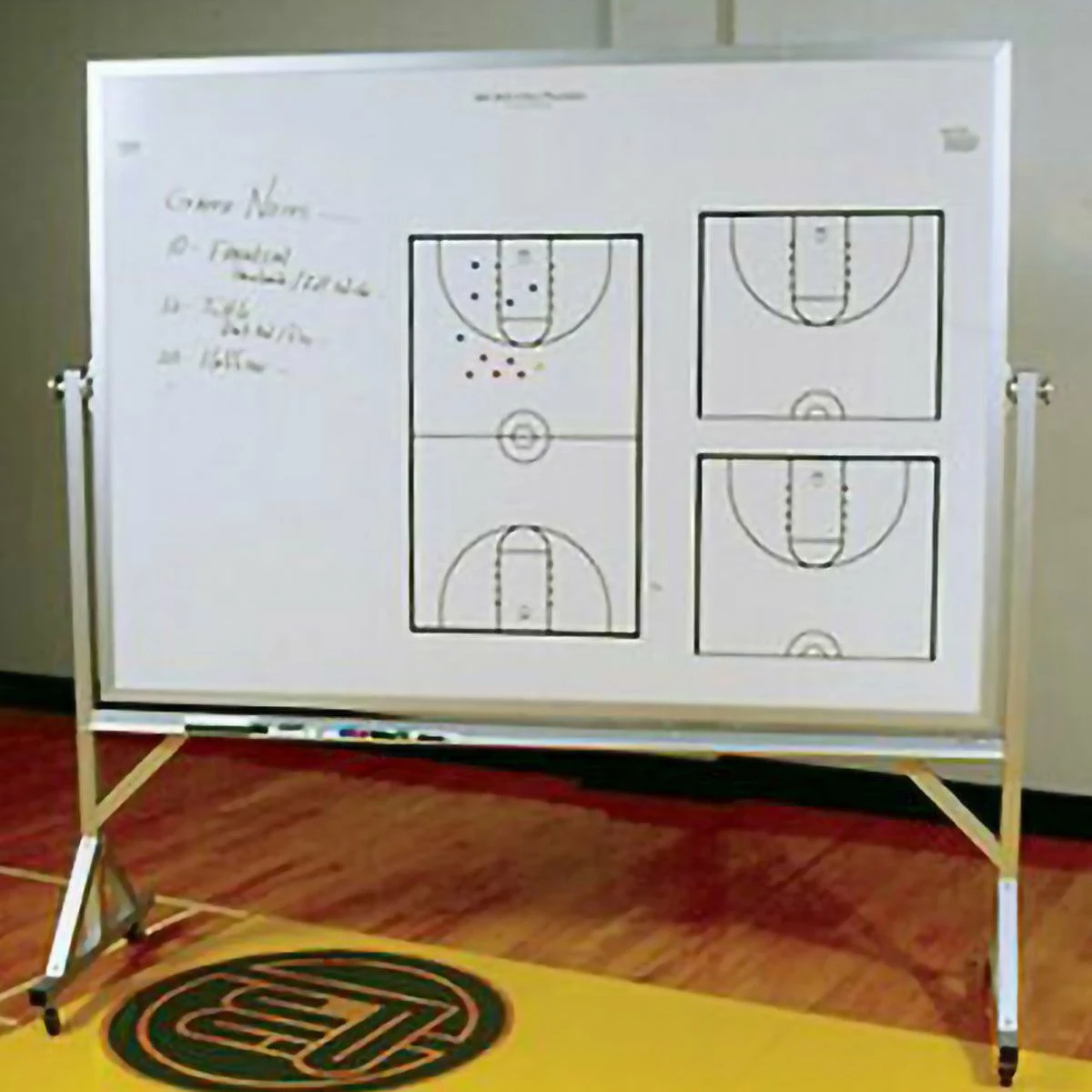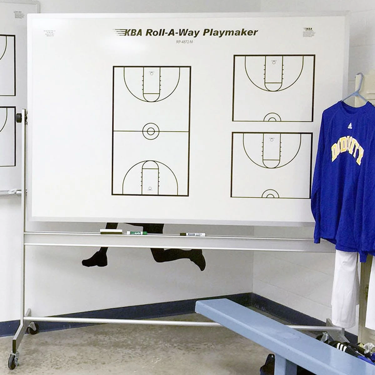 The KBA Roll-A-Way basketball playmaker is a multi court, full sized coaching board that features a front side with one full court, two half courts and additional space for coach’s assignments, game strategy and instruction. The reverse side has a large porcelain steel dry erase markerboard surface.The board has a heavy-duty aluminum frame that revolves and a positive locking mechanism to hold the board in place while in use. 2-1/2″ casters allow for easy movement on any hard surface. The board includes 4 dry erase pens, dry eraser and magnetic pieces with vinyl numbering system.