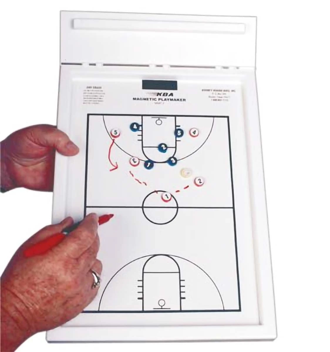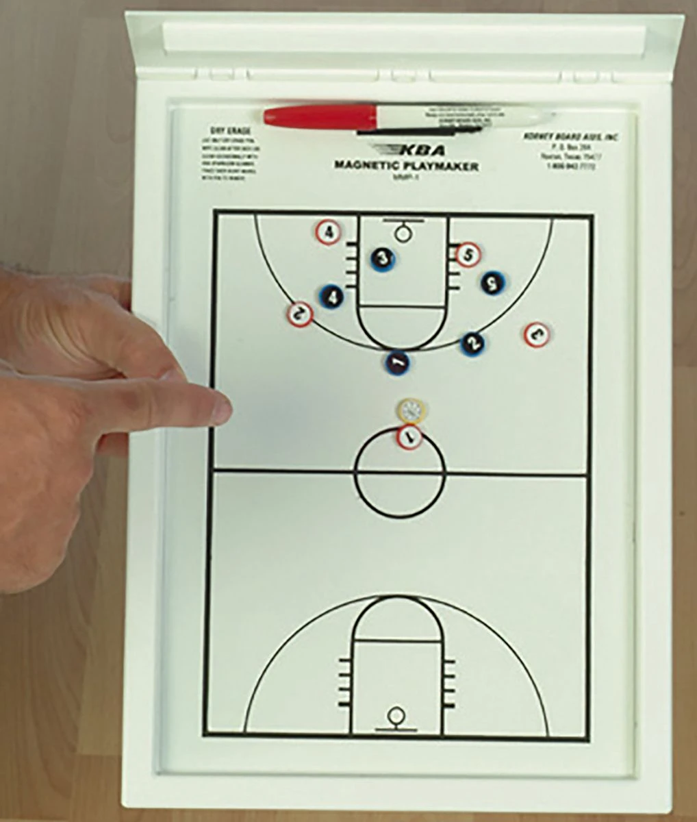 The KBA magnetic Playmaker features a dry-erase surface that wipes clean with a dry erase pen/eraser combo. This basketball coaching board is made of high impact styrene plastic for long-lasting use. Coaching board magnets and a dry-erase pen are included for enhanced presentations. Store the magnets and pen under a hinged cover when closed. Simply open the cover for access to the pen and magnets when you are ready to coach. Elevate your play calling with a set of included numbering stickers for the magnets. This basketball coaching board comes with 5 blue magnets, 5 yellow magnets, and 1 red magnet for the ball. This is one of our best-selling basketball coaching boards. Get one for your team today!
