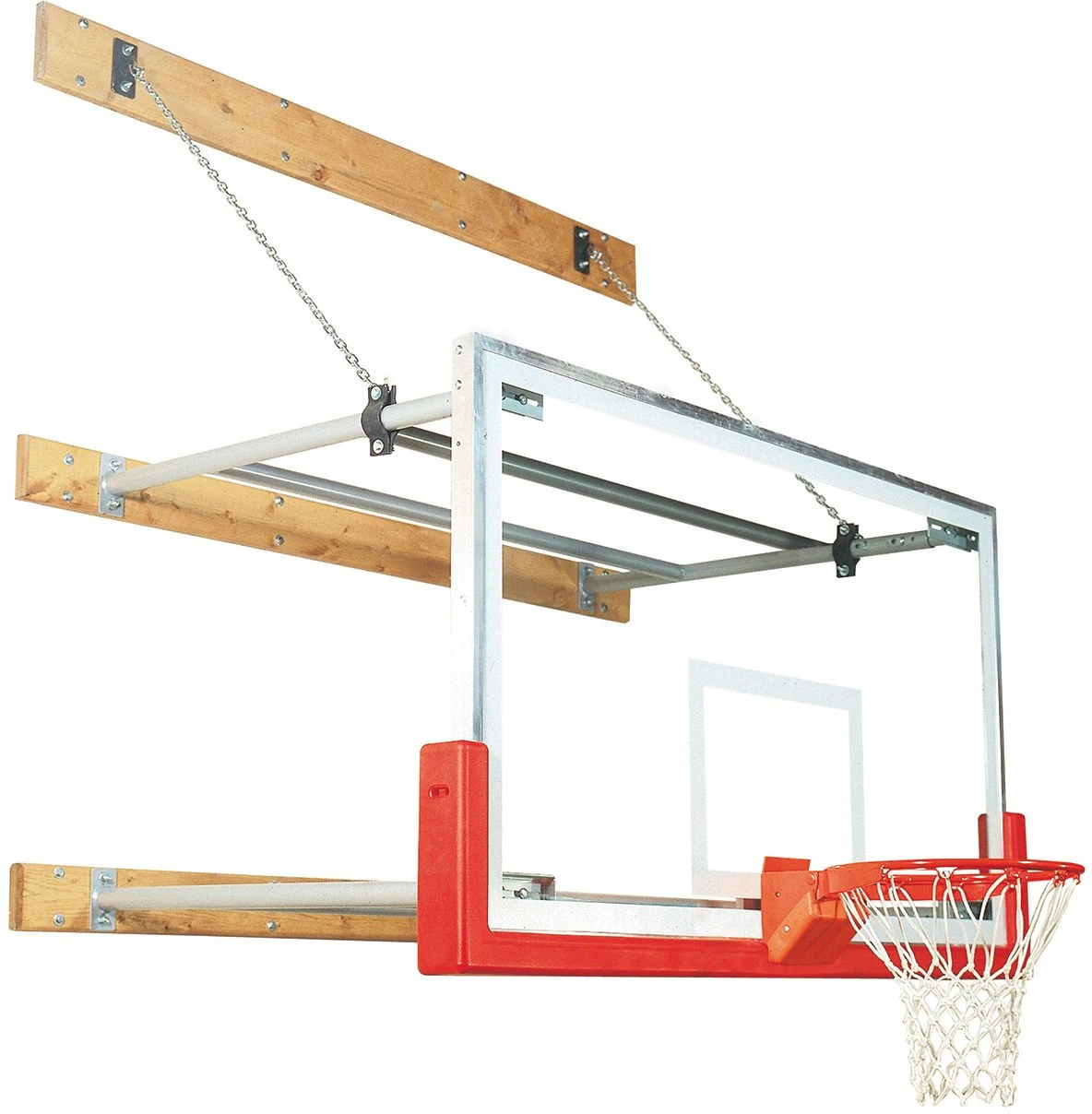 Bison’s wall mounted basketball unit features a telescoping structure design which simplifies ordering and installation. Structure adjusts backboard face anywhere from 6′ to 8′ from the wall at the time of installation. Backstop has an extra heavy steel tubular design with silver powder coated finish. System includes structure, wall boards, support chains, backboard, breakaway goal, net & hardware. Hardware required to anchor wall boards to wall is not included.