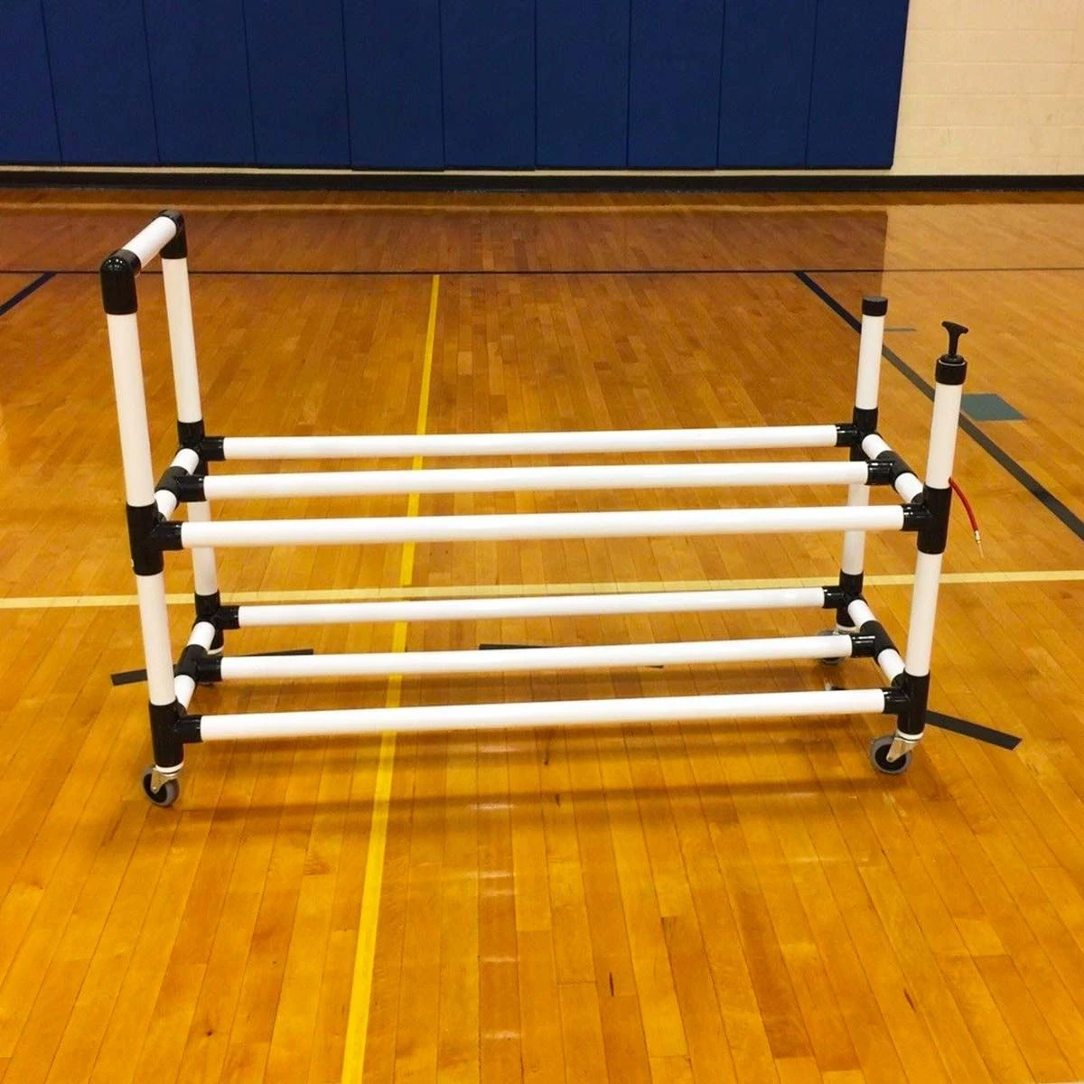 This Power Dribble ball cart is the only sports ball cart on the market that features a built in air pump for convenience. This cart can hold up to 20 sports balls and assembles in just minutes. The Power Dribble cart passes through any standard doorway. The heavy-duty 3β swivel casters have no-mark rubber wheels that wonβt scuff your gym floor. Lock the casters to secure the cart in place. The Power Dribble cart is skillfully crafted with high-quality, structural-grade PVC plastic with rounded edges for user safety. The Power Dribble is a great cart to use for basketballs, volleyballs, soccer balls and recreational playground balls.