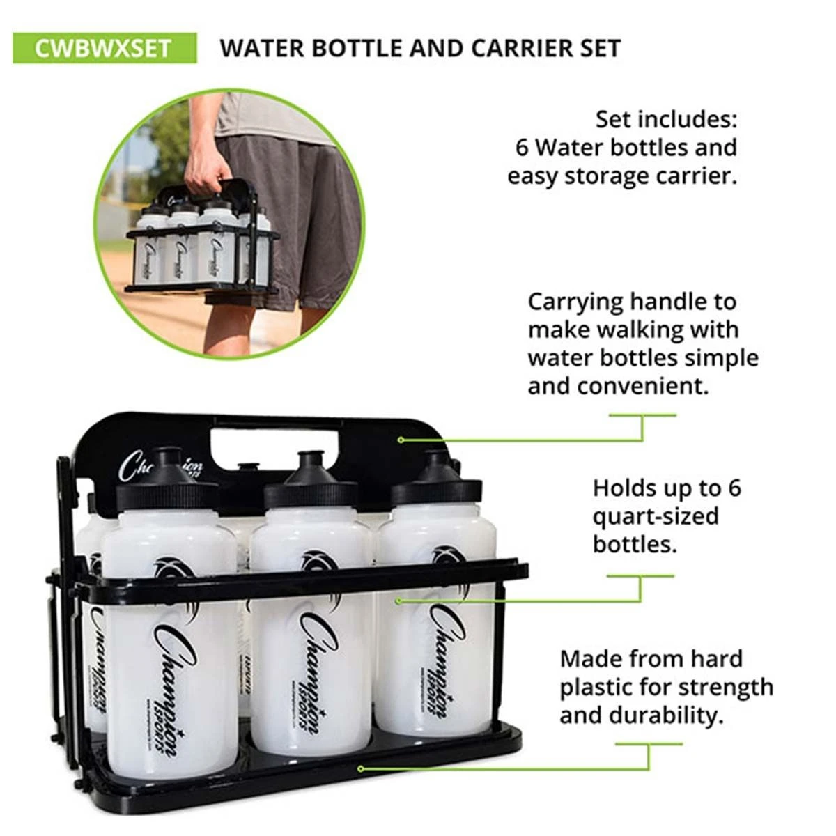 This water bottle and carrier set includes six 1-quart polyethylene squeeze bottles and a collapsible carrier. These comfort-grip squeeze bottles have a push/pull lid and high volume flow for reducing germ transfer and a wide opening for easily adding ice.