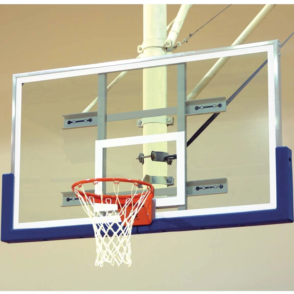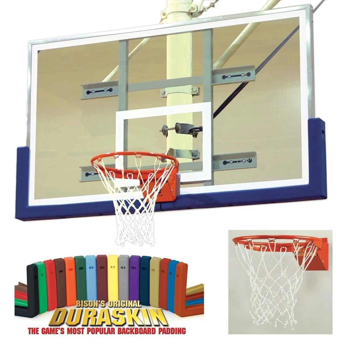 The OFC423E Bison conversion backboard rim package is the most economical way to convert side courts with fan backboards to sidecourts with full-sized, glass backboards. This conversion backboard package can be installed by a capable maintenance crew. The backboard has a frame that matches the mounting pattern of you fan board to the new glass backboard. This package includes a standard 42″ short unbreakable backboard, ProTech breakaway goal, and Duraskin indoor backboard padding. The backboard is pre-drilled for original DuraSkin backboard padding and is constructed of 1/2″ tempered glass, as well as aluminum framework. For great visibility, there is a bright white border and shooters square on the board. The DuraSkin indoor backboard padding comes in 17 different colors, is extremely thick and is constructed of durable foam molded-in steel. The ProTech breakaway goal is made for 42″ glass backboards only. It features a heat-treated ball and socket and a positive lock mechanism that provides excellent rebound consistency over the life of the goal. It has a steel cover-plate and continuous netlocks.